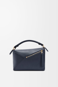The Puzzle bag is the debut bag for LOEWE by Creative Director Jonathan Anderson. A cuboid shape and precise cutting technique create Puzzle’s distinctive geometric lines. This small version is crafted in soft grained calfskin. - Shoulder, crossbody or hand carry - Detachable and adjustable strap, top handle - Zip closure with calfskin pull - One external zip rear pocket, one internal slip pocket - Herringbone cotton canvas lining - Embossed Anagram Details - Colour : Deep Navy - Metallic colour : Gold - Main material : Soft Grained Calf - Strap length : 80.5 - 115.5 cm - Strap Drop : 40 - 58 cm - Handle drop : 7 cm - Weight : 0.57 kg - Height (cm) : 16.5 - Width (cm) : 24 - Depth (cm) : 10.5 - Height (inch) : 6.5 - Width (inch) : 9.4 - Depth (inch) : 4.1 - Model ID : A510P60X77 - CIL : - 0011207925 - Made in : Spain