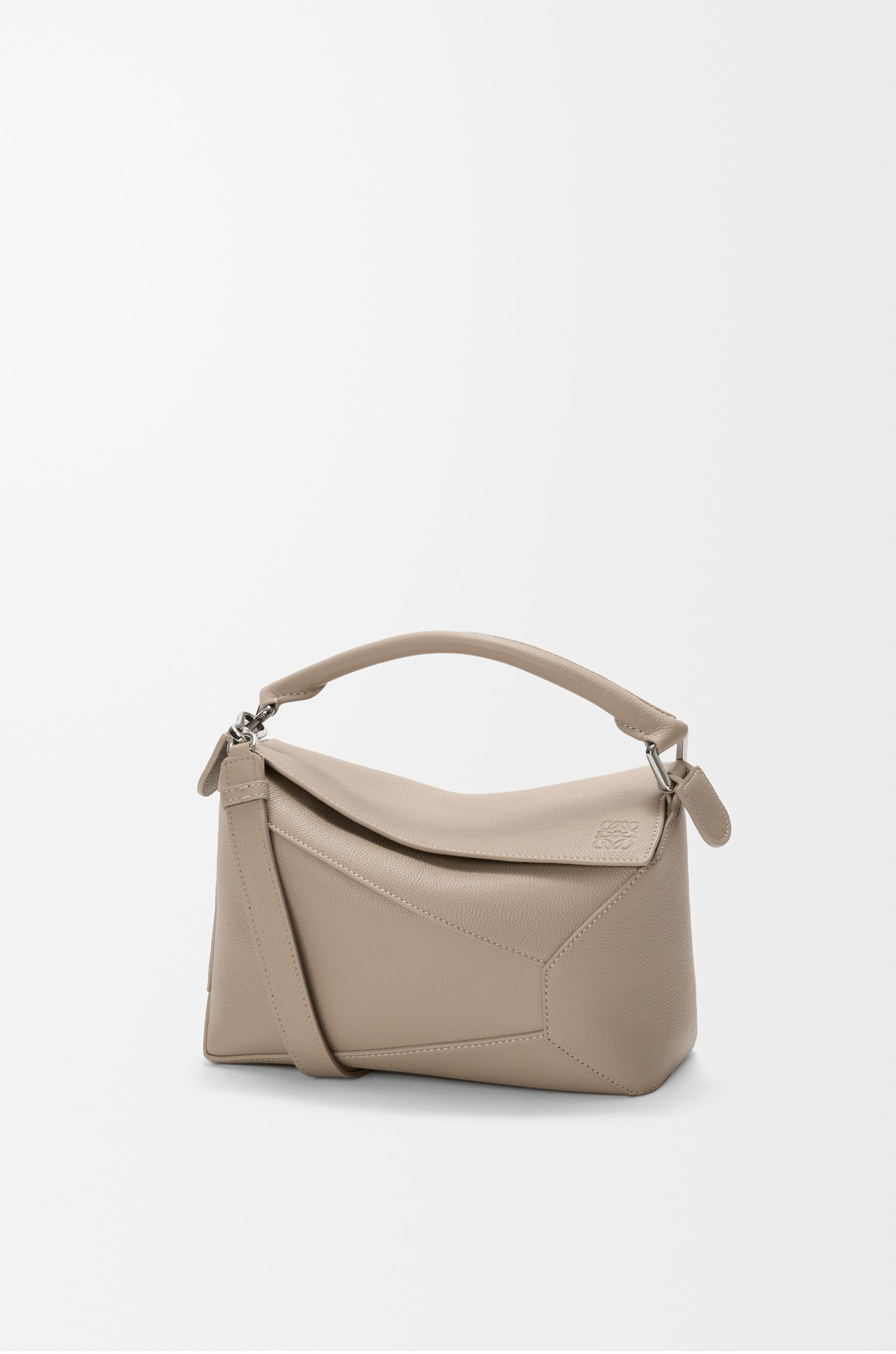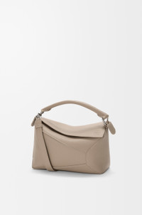 The Puzzle Edge is defined by its distinctive geometric lines and its cuboid form. It differs to the classic construction in its overlapped panels with single stitch lines. This small version is crafted in soft grained calfskin. - Shoulder, crossbody or hand carry - Detachable and adjustable strap - Zip closure with calfskin pull - One external zip rear pocket, one internal slip pocket - Herringbone cotton canvas lining - Embossed Anagram Colour: Clay Metallic colour: Palladium Main material: Soft Grained Calf Strap length: 80.5 - 115.5 cm Strap drop: 40 - 58 cm Handle drop: 7 cm Weight: 0.57 kg Height: 16.5 cm Width: 24 cm Depth: 10.5 cm Made in: Spain