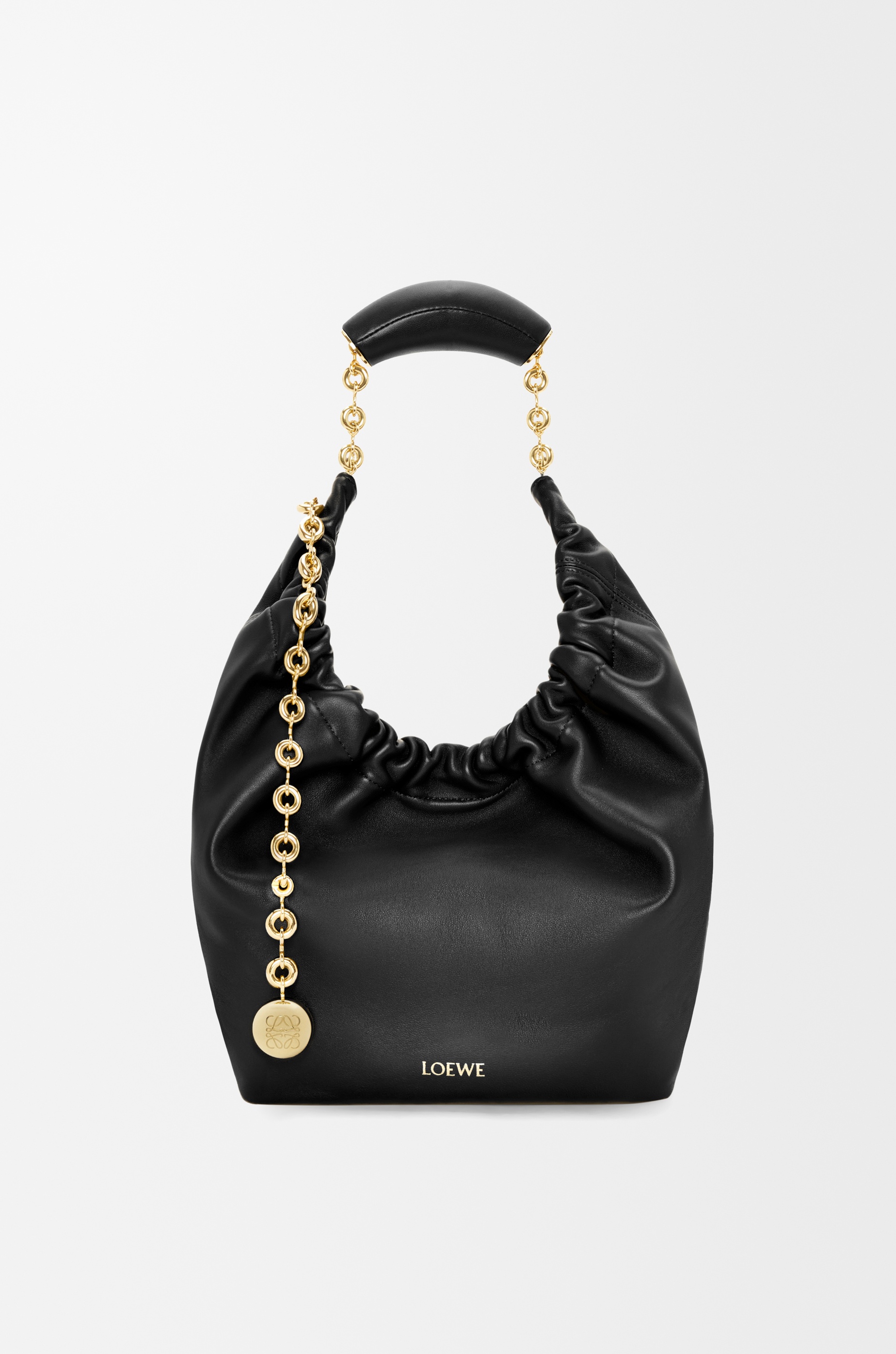 The Squeeze bag is a sophisticated and feminine bag in buttery nappa leather. It is a masterpiece of traditional craftsmanship, innovative research and distinctive design, with a surprisingly light ruched body, an adjustable donut chain and a tactile squeezy handle. This is a small version in nappa lambskin - Shoulder, crossbody or hand carry - Adjustable chain strap with Anagram engraved pebble and additional chain to extend the strap further - Magnetic closure - Internal zipped pocket - Unlined - Gold embossed LOEWE Details - Colour: Black - Metallic colour: Gold - Main material: Mellow Nappa Lambskin - Strap length: 20 cm - Handle drop: 48 - 100 cm - Weight: 0.5 kg - Height (cm): 24 - Width (cm): 29 - Depth (cm): 10.5 - Height (inch): 9.4 - Width (inch): 11.4 - Depth (inch): 4.1 - Model ID: A914NCHX01 - CIL: 0010948008 - Made in: Spain