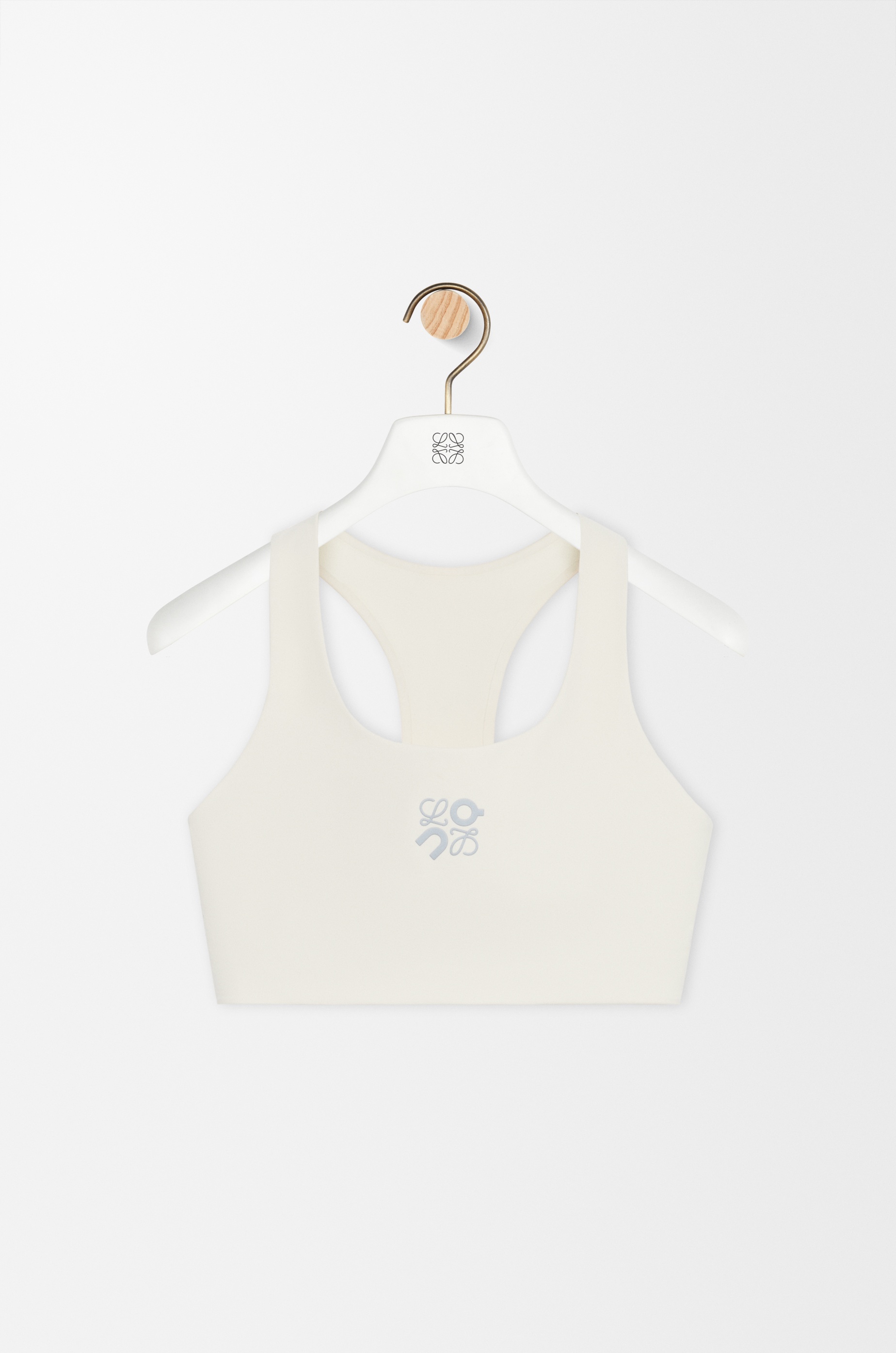 Bra in lightweight sculping stretch 3D technical jersey featuring a scoop neck with a racerback and a spacer and underband for coverage and support. - Slim fit, cropped length - Elasticated hem - Bonded seams and flatlock stitching - Reflective Anagram placed at the front - Reflective LOEWE ON logo placed at the back Colour: Ivory Main material: Polyester/Elastane Weight: 0.1 kg Materials & care Main Material: 72% polyester 28% elastane