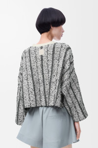 Sweater in medium-weight textured wool featuring a boxy silhouette. - Relaxed fit, short length - Jersey stitch - Round neck - Ribbed collar - Self-start cuffs and hem - LOEWE Anagram rubber patch placed at the back Colour: White/Black Main material: Wool/Polyamide Weight: 0.54 kg Made in: Italy Materials & care Main Material: 36% wool 34% polyamide 30% polyester