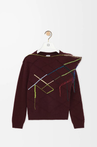 Sweater in medium-weight wool featuring an asymmetric neckline with a square shape on one side and Argyle-inspired hand-embroideries. - Regular fit, regular length - Round neck with contrast topstitching - Ribbed collar, cuffs and hem - Anagram embroidery placed at the back Colour: Burgundy Main material: Wool Weight: 0.17 kg Made in: Italy Materials & care Main Material: 100% wool