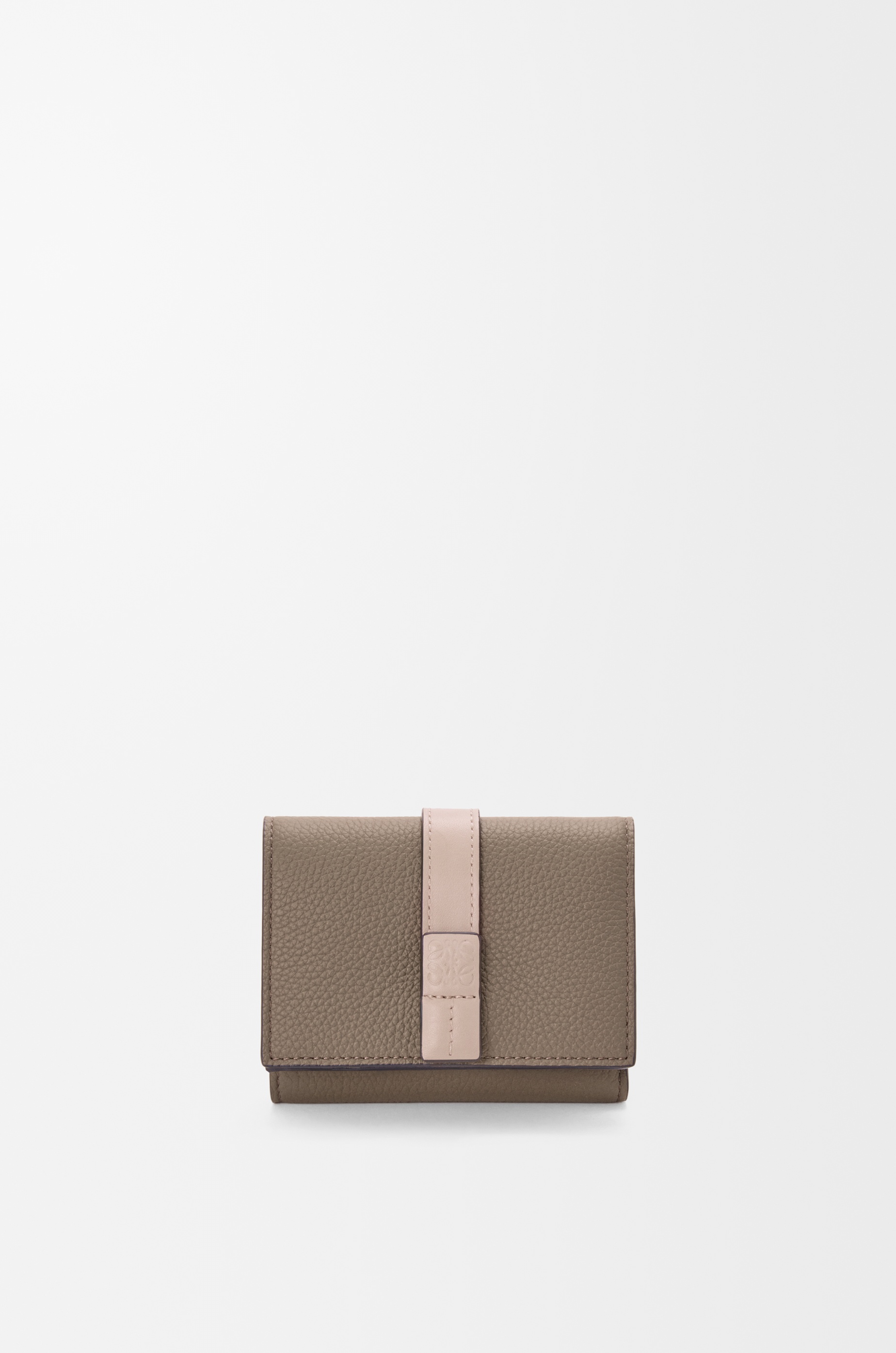 Trifold wallet in soft grained calfskin. - Six card slots, one large pocket - One coin compartment with snap button closure - Snap button closure - Calfskin lining - Embossed Anagram Colour: Taupe/Talc Metallic colour: Gold Main material: Soft Grained Calf Weight: 0.11 kg Height: 7.8 cm Width: 10.2 cm Depth: 3.8 cm Made in: Spain