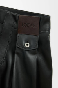 Trousers in lightweight nappa lambskin featuring pleats at the front. - Relaxed fit, regular length - Mid waist, loose leg - Concealed button fly - Buttoned coin pocket, seam pockets and rear patch pocket - Partially lined - LOEWE embossed leather patch placed at the front Colour: Black Main material: Nappa Weight: 1.01 kg Made in: Spain Materials & care Main Material: 100% lambskin