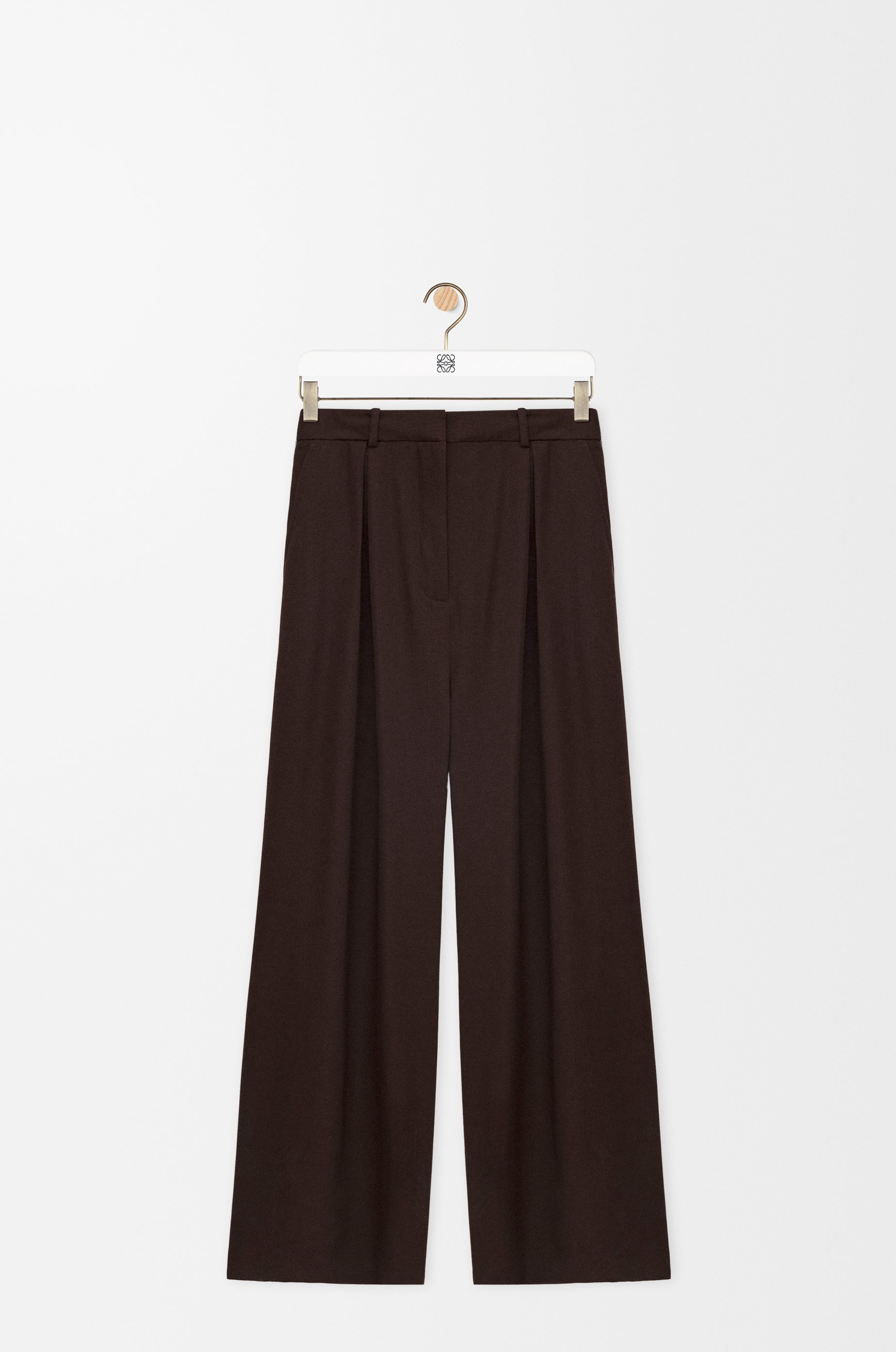 Trousers in lightweight fluid wool gabardine featuring a contrast rib waistband at the back and pleats at the front. - Regular fit, regular length - Mid waist, straight leg - Concealed zip fly - Slash pockets - LOEWE embossed leather patch placed at the back Colour: Brown Main material: Wool Weight: 0.5 kg Made in: Italy Materials & care Main Material: 100% wool