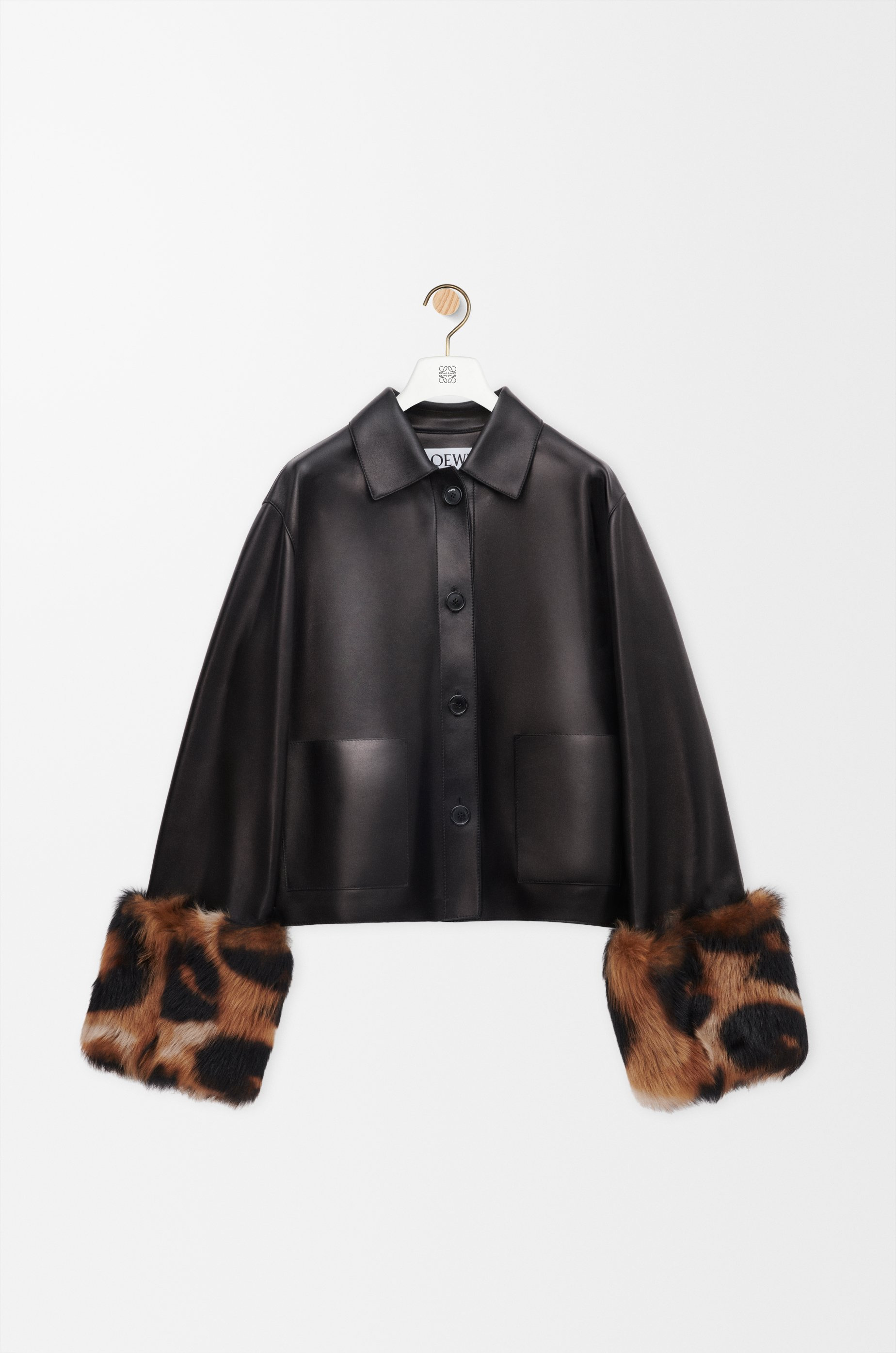 Jacket in lightweight nappa plonge lambskin featuring turn-up sleeves with detachable printed shearling cuffs. - Regular fit, regular length - Classic collar - Button front fastening - Patch pockets - Embossed Anagram placed at the back Colour: Black Main material: Nappa Weight: 0.9 kg Made in: Spain Materials & care Main Material: 100% lambskin