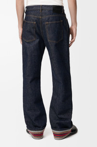 Jeans in medium-weight double face cotton denim featuring a striped brushed cotton lining and turn-up cuffs. - Relaxed fit, regular length - Mid waist, straight leg - Concealed button fly - Five pocket style - LOEWE embossed leather patch placed at the back Colour: Raw Denim/Blue Main material: Cotton Weight: 0.95 kg Made in: Italy Materials & care Main Material: 100% cotton