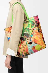 The Puzzle Fold tote is a soft and lightweight design inspired by the iconic bag, whose geometric lines are reimagined as graphic and architectural panels engineered to fold completely flat. This XL version is crafted in classic calfskin and features an artwork collage print enriched with leather marquetry, carved-out details, carpet stitching, embroidery, fringes and rhinestones. This bag is part of a special Richard Hawkins x LOEWE collaboration. - Shoulder or hand carry - Suede lining - Gold embossed LOEWE Details - Colour : Vivid Green/Multicolor - Main material : Calfskin - Handle drop : 26 cm - Weight : 0.75 kg - Height (cm) : 41 - Width (cm) : 42 - Depth (cm) : 18 - Height (inch) : 16.1 - Width (inch) : 16.5 - Depth (inch) : 7.1 - Model ID : B779Q18X29 - CIL : - 0011142700 - Made in : Spain