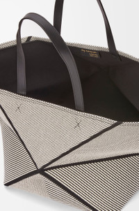 The Puzzle Fold tote is a soft and lightweight design inspired by the iconic bag, whose geometric lines are reimagined as graphic and architectural panels engineered to fold completely flat. This special edition created in collaboration with US-based artist Kay Sekimachi showcases her pioneering work in loom weaving, inspired by her 1999 linen series Takarabako. This XXL version is crafted in cotton jacquard with calfskin handles. - Shoulder or hand carry - Textile lining - Gold embossed Kay Sekimachi LOEWE Details - Colour : Natural/Black - Main material : Textile - Weight : 1.086 kg - Height (cm) : 36.5 - Width (cm) : 73 - Depth (cm) : 36.5 - Height (inch) : 14.4 - Width (inch) : 28.7 - Depth (inch) : 14.4 - Model ID : A779PFMX26 - CIL : - 0011124849 - Made in : Spain