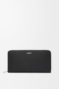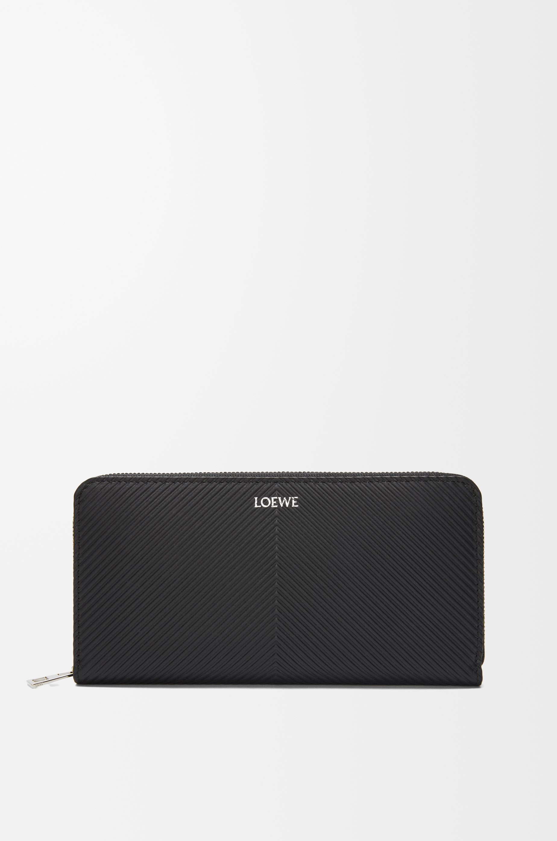 Zip around wallet in classic calfskin embossed with a chevron pattern. - Twelve card slots and two large pockets for notes - Two gusset sections - Zip coin compartment - Calfskin lining - Silver embossed LOEWE Details - Colour : Black - Metallic colour : Palladium - Main material : Classic Calf - Weight : 0.2 kg - Height (cm) : 10 - Width (cm) : 19 - Depth (cm) : 2 - Height (inch) : 3.9 - Width (inch) : 7.5 - Depth (inch) : 0.8 - Model ID : C779T12X01 - CIL : - 0011110384 - Made in : Spain