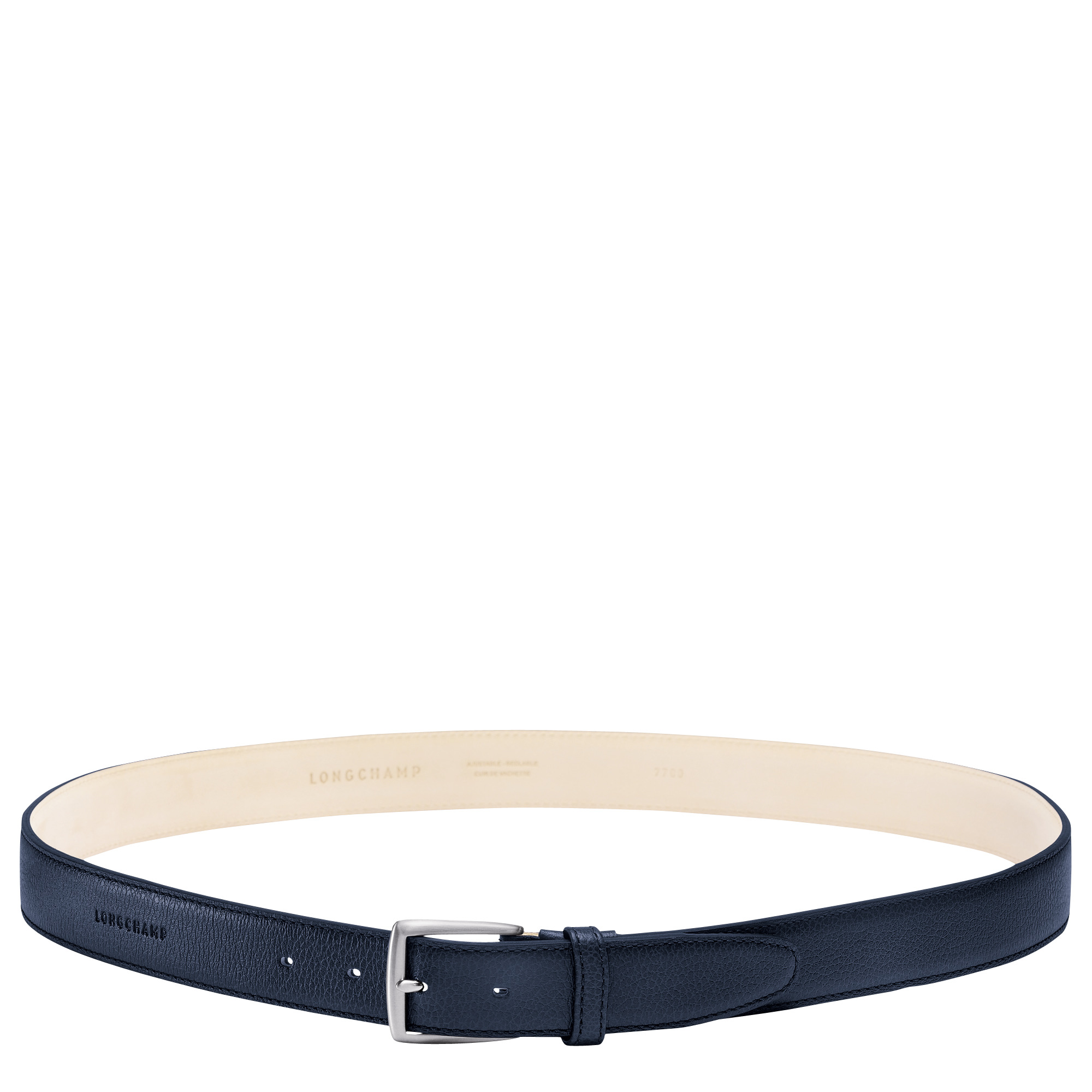 Product Details Reference : L7700021556 Dimensions : 43.3 in (L) x 1.2 in (H) Material : Cowhide leather Lining : Nubuck cowhide Trimming : Nickel Exterior details Buckle type : Pin buckle Details : Hot-stamped ‘Longchamp’ signature Adjustable : YES