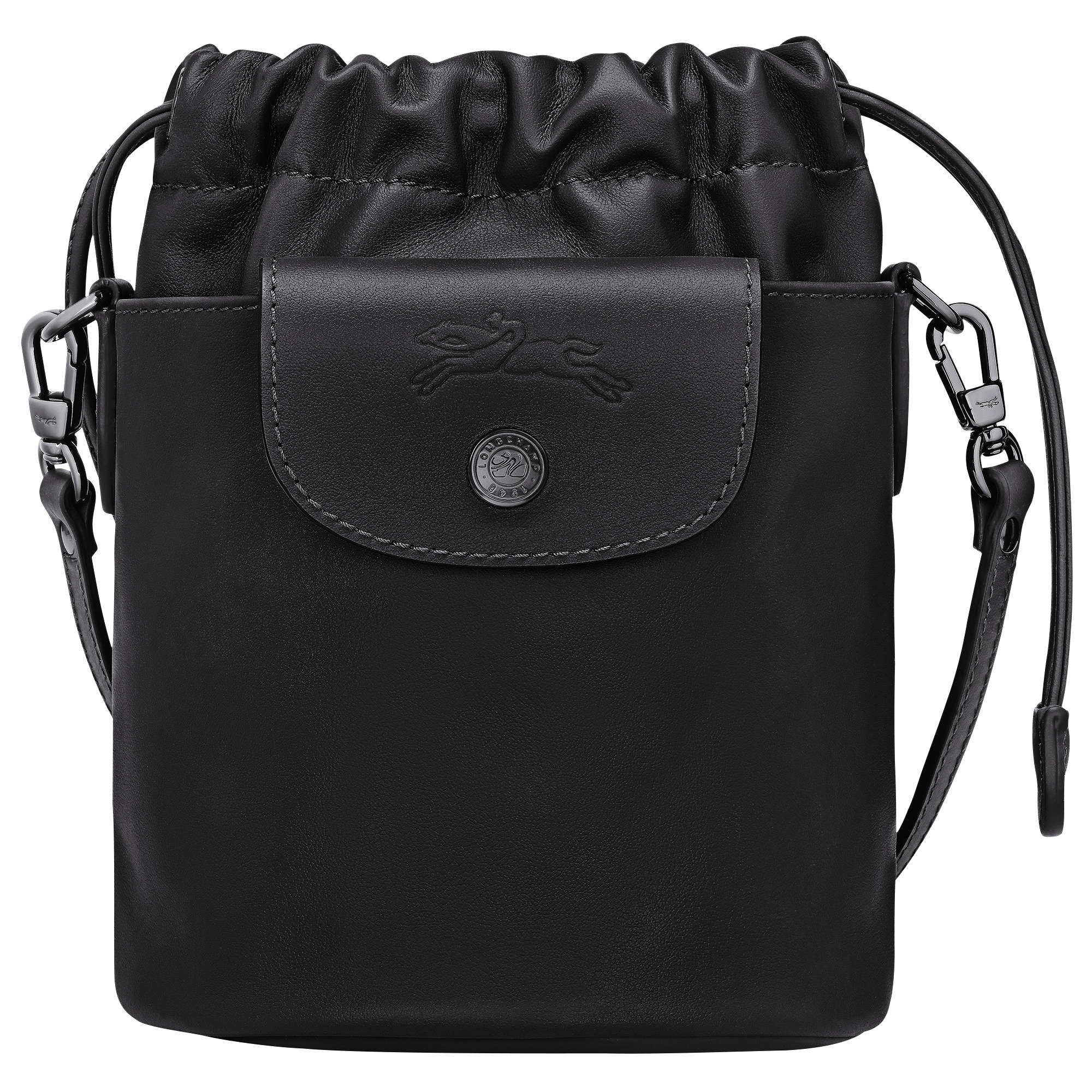 Product Details Reference : 10317987001 Dimensions : 5.3 in (L - measured at the base of the bag) x 7.5 in (H) x 4.7 in (W) Material : Cowhide leather Metallic Hardware : Dark silver color Weight : 0.48 lb Closing : Drawstring The leathers of Longchamp bags may have subtle variations. These reflect the vivid nature of the leathers used in our workshops and reveal the authenticity of their appearance as well as their exceptional quality. Exterior details Strap : Adjustable and removable