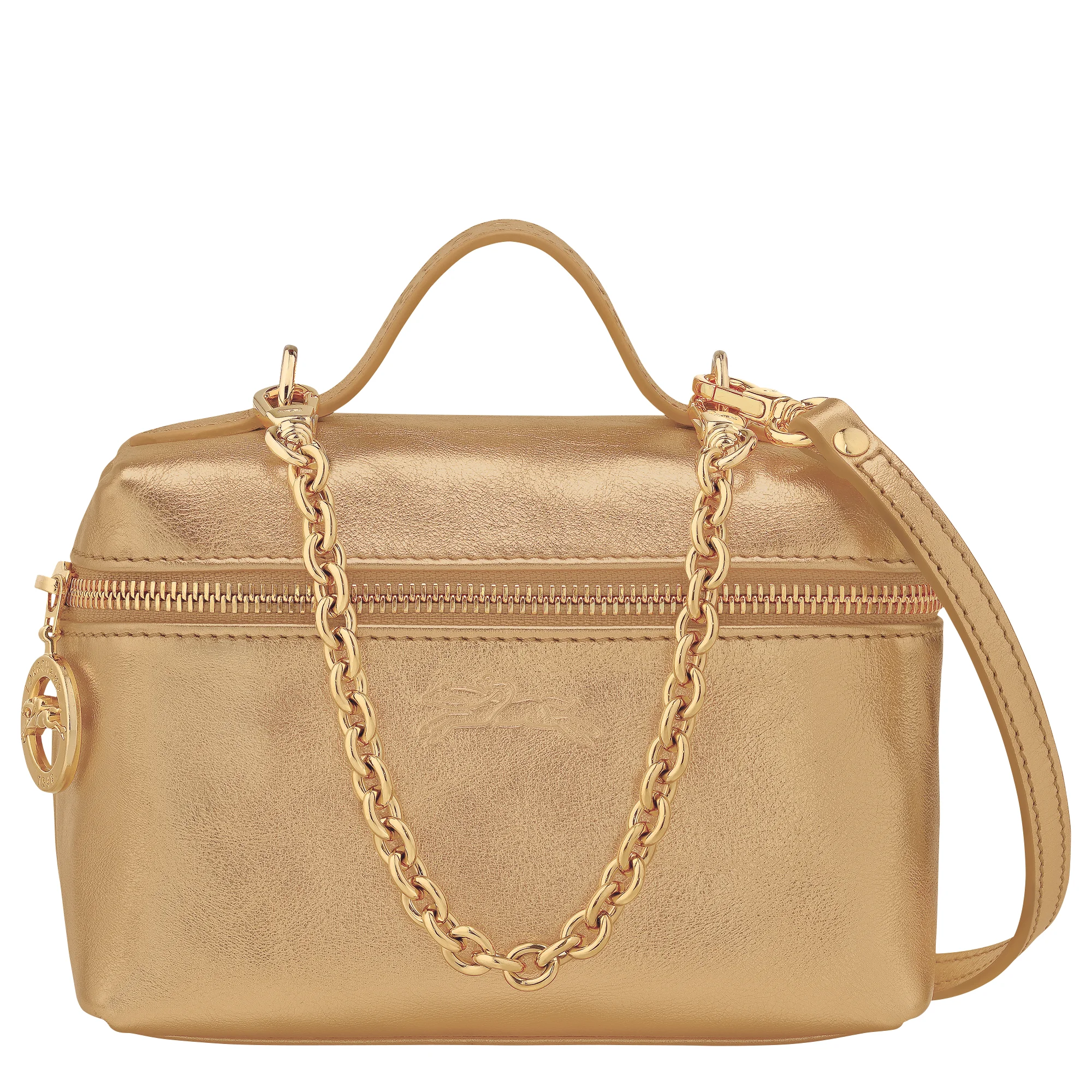 Product Details Reference : 10187HIO124 Dimensions : 6.3 in (L - measured at the base of the bag) x 3.9 in (H) x 4.3 in (W) Material : Metallic calfskin leather Metallic Hardware : Gold color Weight : 0.62 lb Closing : Zipper The leathers of Longchamp bags may have subtle variations. These reflect the vivid nature of the leathers used in our workshops and reveal the authenticity of their appearance as well as their exceptional quality. Exterior details Strap : Adjustable and removable