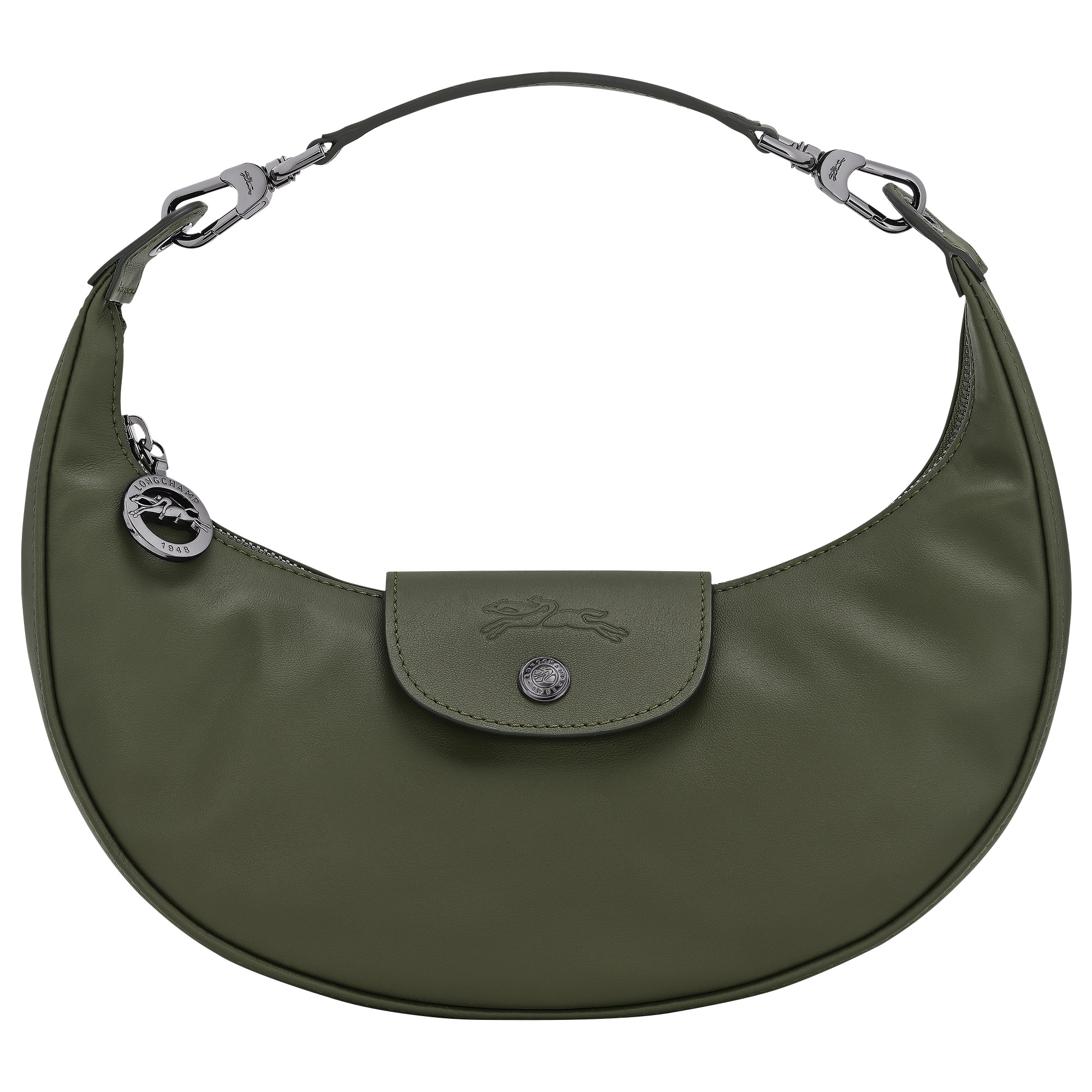 Product Details Reference : 10316987549 Dimensions : 10.6 in (L - measured at the base of the bag) x 4.7 in (H) x 3.3 in (W) Material : Cowhide leather Metallic Hardware : Dark silver color Weight : 0.60 lb Closing : Zipper and snap button The leathers of Longchamp bags may have subtle variations. These reflect the vivid nature of the leathers used in our workshops and reveal the authenticity of their appearance as well as their exceptional quality. interior details Zipped pocket : 1