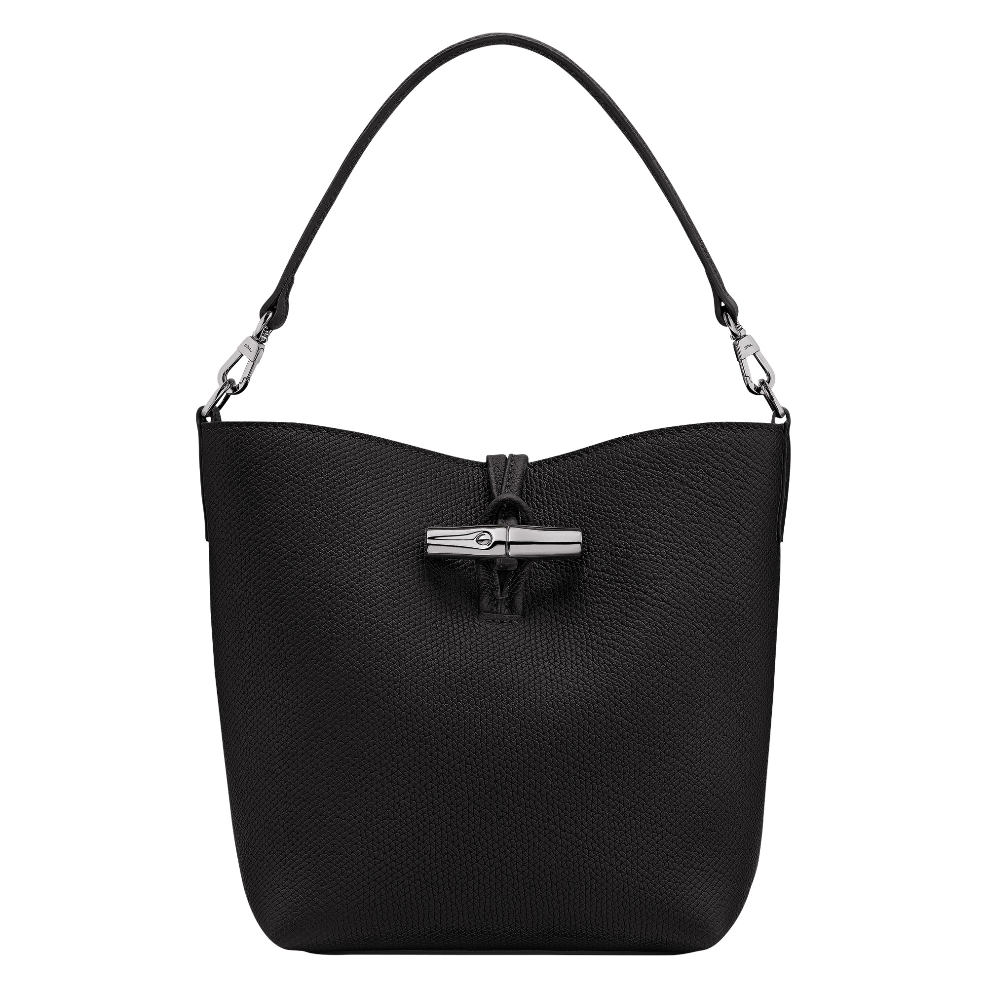 Product Details Reference : 10314HFP001 Dimensions : 6.7 in (L - measured at the base of the bag) x 8.3 in (H) x 4.3 in (W) Material : Cowhide leather Metallic Hardware : Silver color Lining : Recycled polyester - Jacquard Longchamp horses Weight : 0.94 lb Closing : Metal bamboo The leathers of Longchamp bags may have subtle variations. These reflect the vivid nature of the leathers used in our workshops and reveal the authenticity of their appearance as well as their exceptional quality. Exterior details Strap : Adjustable and removable