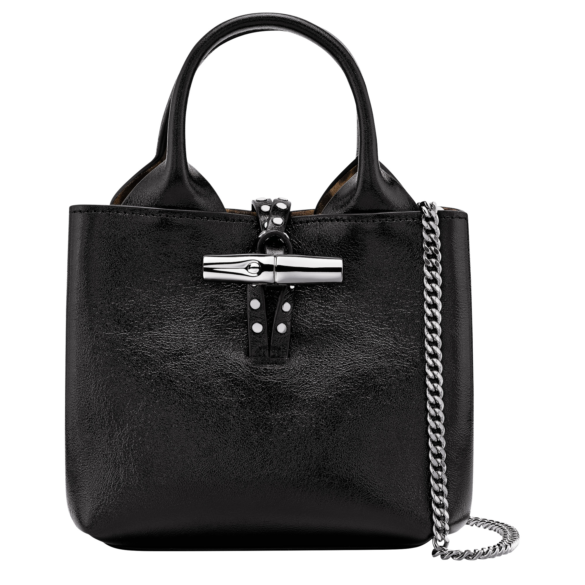 Product Details Reference : 10278HIH001 Dimensions : 5.9 in (L - measured at the base of the bag) x 5.9 in (H) x 3.5 in (W) Material : Cowhide leather Metallic Hardware : Silver color Lining : Recycled polyester - Panther Jacquard Weight : 0.95 lb Closing : Metal bamboo The leathers of Longchamp bags may have subtle variations. These reflect the vivid nature of the leathers used in our workshops and reveal the authenticity of their appearance as well as their exceptional quality. Exterior details Strap : Removable interior details Zipped pocket : 1 Credit card space : 1
