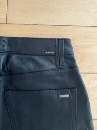 Item: Amiri Leather and Denim Jeans Color: Blue/Black Size : 27 (fits a men 28-29) Brand : Amiri Made in: USA Composition: Body 1: 100% Cotton, Body 2: 100% Leather Description : Amiri Leather and Denim Jeans, front in full deanim, back in full leather, 5 pocket construction, Amiri Plaque at back pocket, amiri leather Patch at back waistband Condition: 10/10 Retail: 1350 Dm for Questions!
