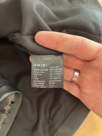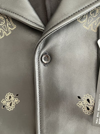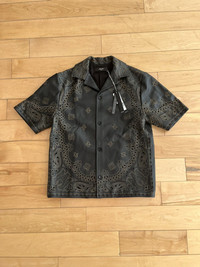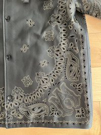 Item: Amiri Leather Bandana Shirt Color: Black Size : 44 Brand : Amiri Made in: Italy Composition: Body: 100% leather. Lining: 100% viscose. Description : Grained leather shirt. Laser-cut perforated detailing, printed logo graphic pattern throughout. · Open spread collar · Button closure · Full viscose twill lining Condition: 10/10 Retail: 3430 Dm for Questions!