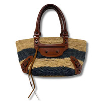 Item:Balenciaga Raffia City Basket Color: Beige/Brown Size : OS Brand : Balenciaga Made in: Italy Composition: Raffia, Calfskin Leather Description : Balenciaga Raffia City Basket, Raffia Body with calfskin Details, SIgnature hardware, Leather Handles, patch pocket at interior Condition: 7/10 - Overall good condition but there is some scratch to the leather and hardware, this bag is from 2007 it has been worn Dm for Questions!