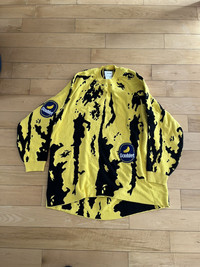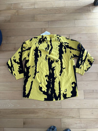 Item: Doublet 1/138 Banana Sweater Color: Yellow Size : L Brand : Doublet Made in: Japan Composition: 70% cotton, 30% banana fibers. Description : Long sleeve jacquard knit cotton and banana fiber-blend sweater in yellow and black. · Rib knit crewneck collar and cuffs · Terrycloth logo patch in blue, yellow, and white bonded at front · Raglan sleeves Condition: 10/10 Retail: 950 Dm for Questions!