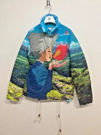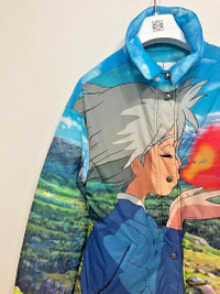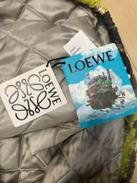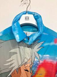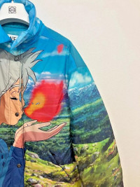 Item:Loewe x Studio Ghibli Howl's moving castle Puffer Coat Color: Blue Size : 36 Brand : Loewe Made in: Italy Composition: Outer: 100% nylon Lining: 52% rayon, 48% cupra Filling: 90% polyester, 10% polyethylene Compare parts: cowhide Leather: calfskin Description : Loewe x Studio Ghibli Howl's moving castle Puffer Coat, features print of studio ghibli print all over, Condition: 7/10 - some fading throughout, there is a ink stain on the tag Dm for Questions!