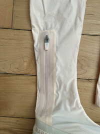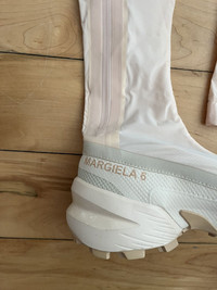 Item: Salomon x MM6 Maison Margiela Crosswader Boots Color: Vanilla cream/Almond milk/Parisian blue Size : 40/7 Brand : Salomon x MM6 Maison Margiela Made in: China Composition: Upper: textile. Sole: rubber. Description : Thigh-high jersey boots in pink. Bonded trim throughout. · Logo printed at sides · Zip vent at inner side · Treaded Contagrip® rubber outsole · Platform: 2.5 in Has a few scuff marks, please see pictures Part of the MM6 Maison Margiela x Salomon collaboration. Condition: 9/10 Retail: 775 Dm for Questions!