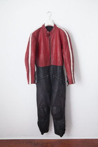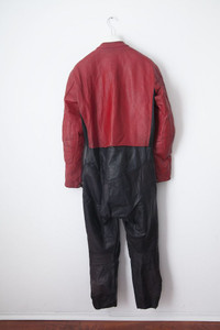 1 vintage Gaman leather riding suit From 1970 Size: Unknown, im 5’9” and 130lbs and it fit me 100% leather Padded knees, elbows, and shoulders. Armpit aerations Vintage condition, no smell, functionning zippers but hard to zip up/down