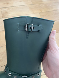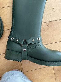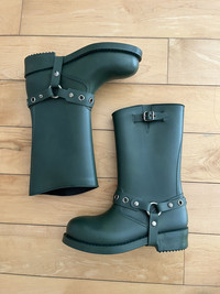 Item: RED Valentino Engineer Rubber Boots Color: Green Size : 37 Brand : RED Valentino Made in: Romania Composition: Rubber Description : Rubber Engineer Boots by Valentino from their RED Line, Features an ajustable strap at upper, harness, and a full rubber body making them waterproof, the boots have a dye mark but it's barely noticeable, please see picture Condition: 9/10 Retail: 325 Dm for Questions!