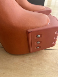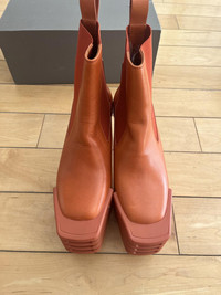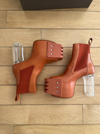 Item: Rick Owens Clear Kiss Heel Orange Sample Color: Orange Size : 38 Brand : Rick Owens Made in: Italy Composition: Leather Description : Rick Owens Clear Kiss Heel Orange Sample , features the classic kiss heel and grill, has a few scuff marks, pull tab at the back, chelsea elastic at top Condition: 8/10 Retail: 2270 Dm for Questions!