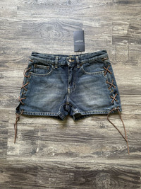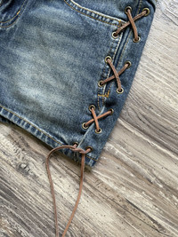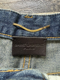 Item:Saint Laurent Paris Leather Lace-Up Denim Short Color: Indigo Size : 24, fits 26" Brand : Saint Laurent Paris Made in: Italy Composition: 100% Cotton, leather Accent Description : Saint Laurent Paris Leather Lace-Up Denim Short, zipper fly, 5 pockets construction, leather tab at back pocket, lace up details at side, Condition: 10/10 - New With Tags Dm for Questions!