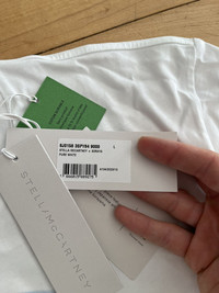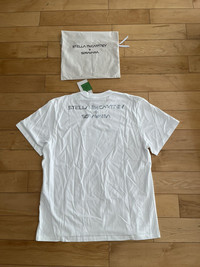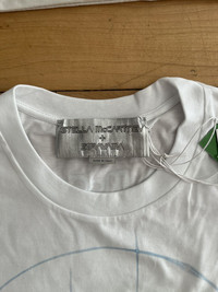 Item: Stella McCartney x Sorayama Holographic T-shirt Color: White Size : L Brand : Stella McCartney Made in: Italy Composition: 100% Organic Cotton Description : GOTS-certified organic cotton jersey T-shirt. · Rib knit crewneck · Metallic foil transfer graphic at front · Dropped shoulders · Logo printed at back Part of the Stella McCartney Sorayama capsule collection. Condition: 10/10 Retail: 465 Dm for Questions!