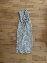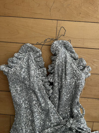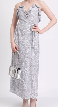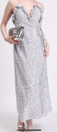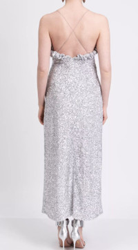 Item: The Attico Sequin Ball Wrap Dress Color: Silver Size : 38 Brand : The Attico Made in: Italy Composition: 100% Polyamide Description : The Attico Sequin Ball Wrap Dress. Maxi Lenght, Features Tiny Chain crossing Straps, Ruffles at cups and back, a tie closure at front side and also one on the inside of the dress, fully lined, Open back. New with tags Condition: 10/10 Retail: 2285 Dm for Questions!