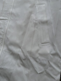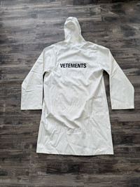 Item:Vetement FW17 Logo Hooded Parka Color: White Size : OS Brand : Vetements Made in: Poland Composition: 100% Polyester Description : Vetement FW18 Logo Hooded Parka, 2 pockets at front, logo at chest and back, hood with cords for ajustment, Condition: 5/10 - Multiple stains throughout, yellowing and dirty, please look at all pictures Dm for Questions!