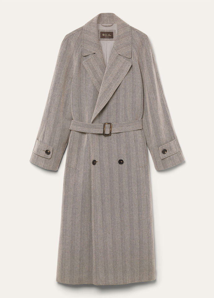 A key silhouette from the Maison's lookbook, the Foster coat is elevated with an unmistakable Loro Piana touch. Ideal for transitioning into the warmer months, it is twill-woven from Linen Wish® Cash Rain®—a unique blend combining the lightness of linen with the gentle warmth of wool and the sumptuous feel of cashmere—and comes finished with Rain System® for protection against the elements. The richly textured blend is reminiscent of Loro Piana's exclusive Cheviot tweed for an air of heritage. Classic cues, in the form of notch lapels, buttoned cuffs, and a back vent, provide an impeccable finish. Product details Notch lapels Straight side pockets Cuff tabs with Sergio horn buttons Cuffs with buttoned flap Front fastening with Sergio horn buttons Double-breasted design Removable belt with horn and leather slide buckle Centre back vent Lined in silk twill Regular fit Single vent Water-repellent finish Composition: 57% Linen, 38% Wool, 5% Cashmere Product code: FAP0388