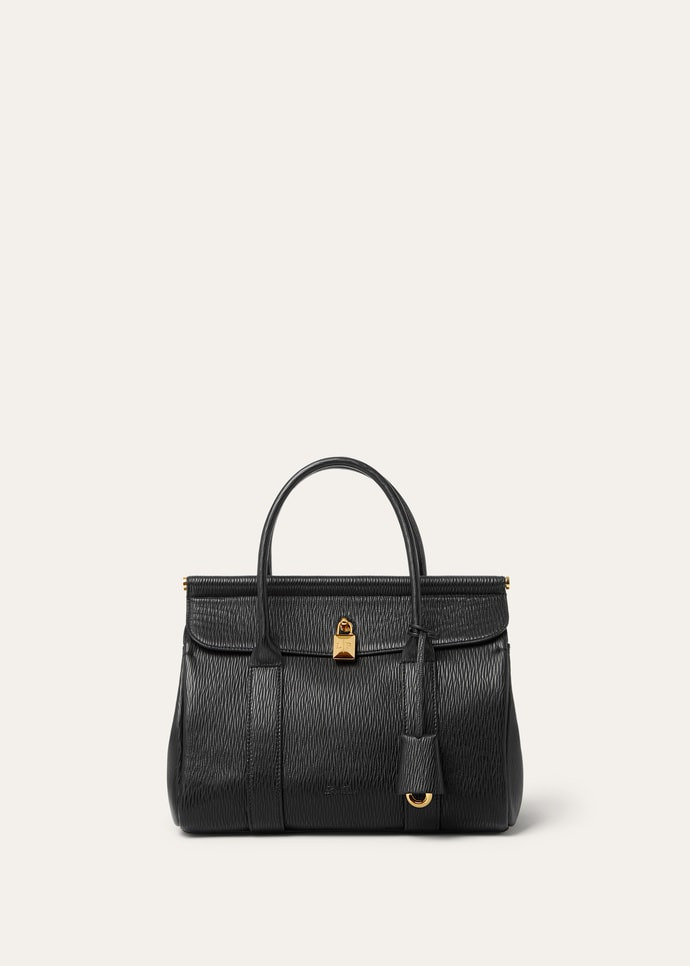 The Loom Bag L25 pays homage to Loro Piana's century-spanning heritage in fabrics and fibers – the metal bar beneath the flap evoking the gentle cascade of cloth draped across the textile loom. Crafted in Soft Zibeline leather, it is anchored with a refined padlock that can be worn closed, or open for a more relaxed look, that retains its signature charm. The timeless accessory is ideal for carrying in the hand or crossbody, offering ultimate versatility. Product details Leather handles Detachable adjustable crossbody strap Signature charm embellishment Interior open leather pocket Internal removable pouch Ring-shaped protective feet on the base Hardware details Dimensions: 25 x 18 x 12.5 cm / 9.8" x 7" x 4.9" Handle drop: 6.5 cm / 2.6" Lined in suede Composition: 100% Lambskin Made in Italy Product code: FAQ0853