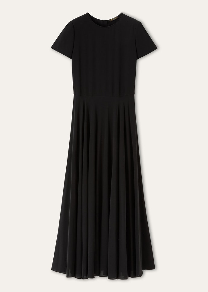 With its luminous shine, the Poline dress moves with a sense of fluidity and grace. Its neat calf-grazing silhouette is cut from sable crepe silk, revealing a refined grainy texture with a subtle flecked finish that plays softly with the light. The clean waist seam elegantly defines the line before cascading into a full flowing skirt. Product details Shirt collar Two chest pockets with flap and button; two lower pockets with flap and button and side-entry pockets; two inner side-entry pockets with snap buttons Cuffs with horn button Horn button front fastening Leather undercollar and leather inserts at pocket flaps Lined in Silk Georgette Regular fit Melange fabric Composition: 100% Silk Made in Italy Product code: FAP7652