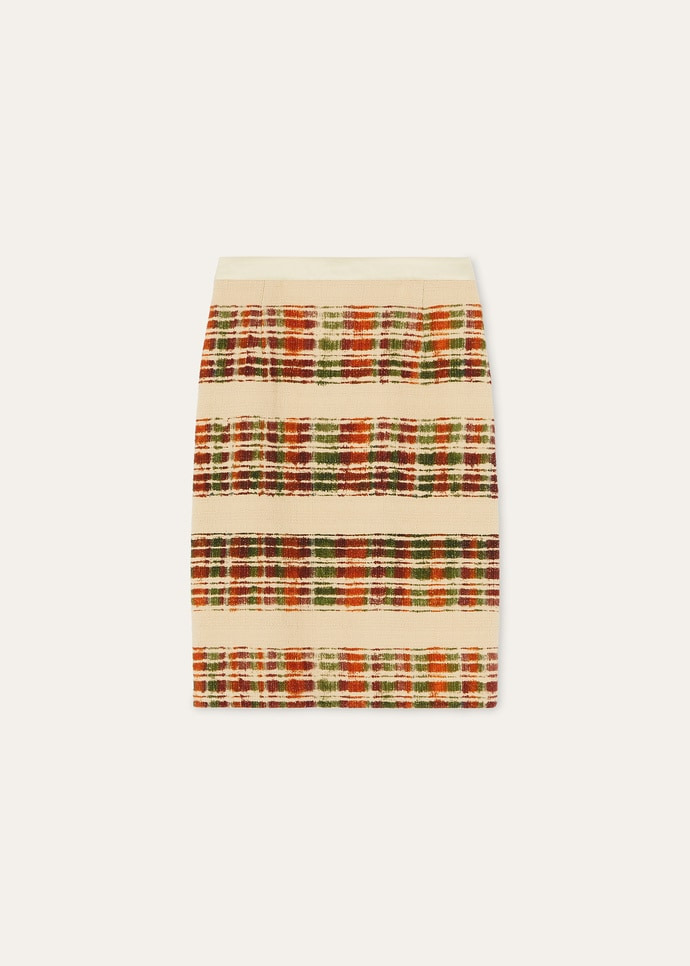 Crafted to match the jacket in the same fabric, the Sylva skirt is rendered in wool boucle with the Suitcase Stripe. The motif is interpreted in soft watercolor shades—with each stripe initially hand-painted for a fluid finish. Complete with a contrasting silk waistband, the garment is designed for a close-fitting line that ends just above the knee. Product details Contrasting silk waistband Concealed zipper and hook fastening at the back Lined in silk satin Watercolor Suitcase Stripe motif Composition: 100% Wool Made in Italy Product code: FAP7736