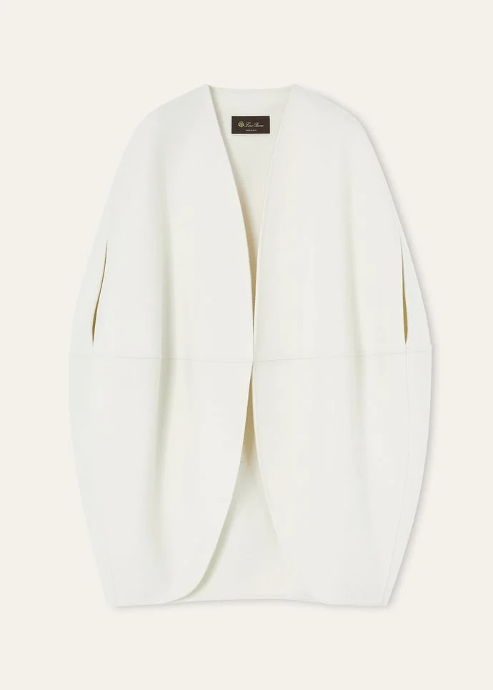 An expression of ultimate luxury, the Vika cape is rendered in Loro Piana's signature Baby Cashmere Double, which sees two layers hand-joined from the inside with meticulous attention to detail. The enveloping silhouette is shaped in an open-front design with side openings for the arms. Finished with a rounded hem and a gently curved seam at the hip, it melds elegance with ease. Product details Rounded hem Length: 92 cm | 36.2 in Composition: 100% Baby Cashmere Made in Italy Product code: FAQ4421