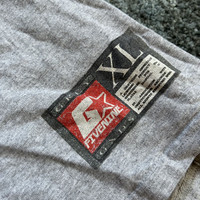 very used. worn and washed. piling, discoloration, fading, graphic cracking. it is in fact a size L Large, though the tag has all but washed off. please read the measurements as the t-shirt has definitely shrunk. the faux athletic tag in the corner reads XL for ALL sizes, as you can see from the og product picture.