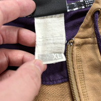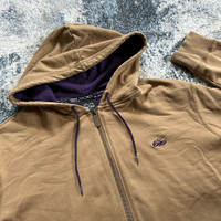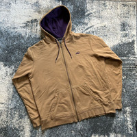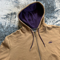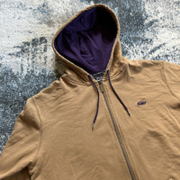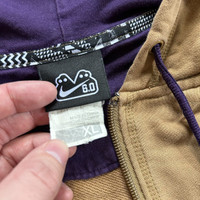 late era nike 6.0 the hood’s lining is purple as are the drawstrings worn and washed, fading, piling, discoloration, small fabric pulls a dog got to the drawstrings and tore those up as well, but they’ve been cauterized nike 6.0 was nike’s “action sports” sub-label from 2005-2011. mostly aimed at the BMX market. it turned out to be the loud, alternative stepbrother of NiKE SB. ill-fated and woefully neglected, like a kid with a hard life and a broken home, the type of kid that’s into indie music and action sports, nike 6.0 never seemed destined for success. the avant garde use of materials, constantly paired with abstract, often obnoxious, color blocking gives its short 6 year run an iconically dated aesthetic. if you are obsessed with the memory and preservation of the DEFUNCT, the way that I am, nike 6.0 scratches a special kind of itch. #mallcore #bmx #xgames