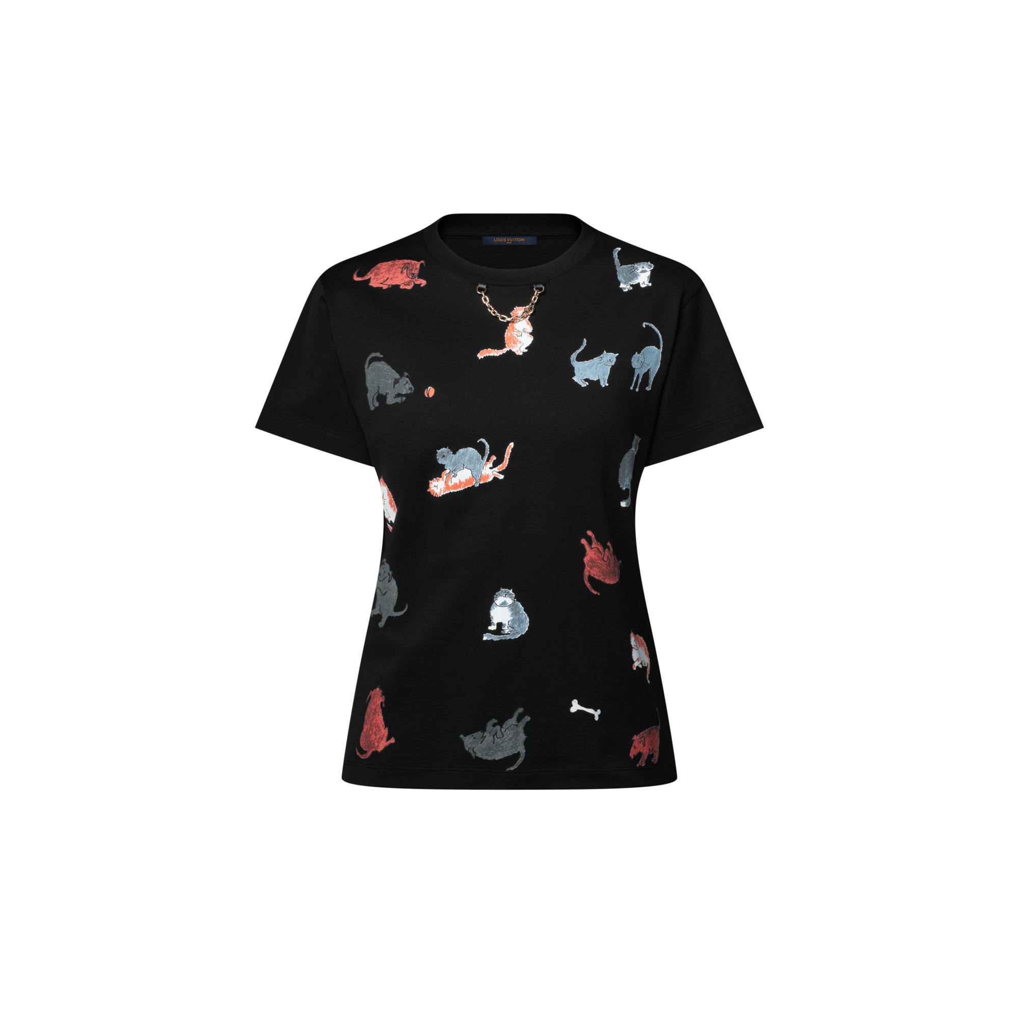 This T-shirt is playfully uplifted with prints of illustrated cats and dogs on the front, as part of the whimsical Travels with Grace Coddington collaboration. It is made from soft, breathable cotton jersey in a casual fitted shape, complete with a ribbed crew neckline trimmed with the House’s signature LV chain detail. - Main material: 100% Cotton - Black - Made in Italy