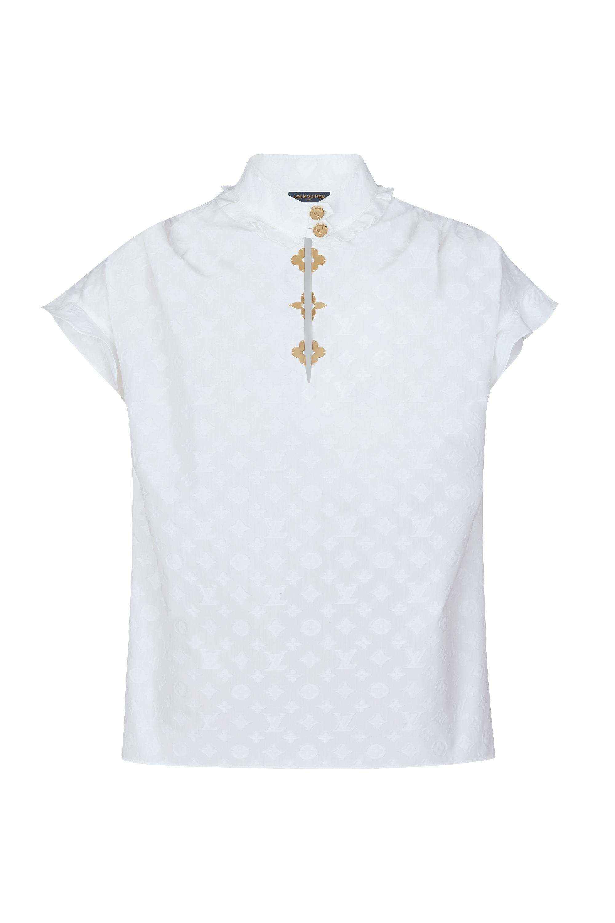 Tailored from soft cotton poplin embellished with Monogram fil coupé, this Frill Blouse features rich details such as gold LV buttons at the collar and golden Monogram Flower shape embellishments along the front. With feminine frill details at the collar and sleeves, this iconic Louis Vuitton piece is a wardrobe must-have. Detailed Features - 100% Cotton - Blanc Optique, White - Slighlty boxy - Model wears size 36 - Model measurements : Bust 32'' / 82 cm, Height 5' 9" / 173 cm, Waist 26" / 66 cm , Hips 35'' / 89 cm - Made in Italy - Do not wash - Do not bleach - Do not tumble dry - Iron at a maximum sole-plate temperature of 110°C - Mild professional dry cleaning in hydrocarbons