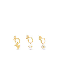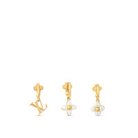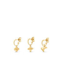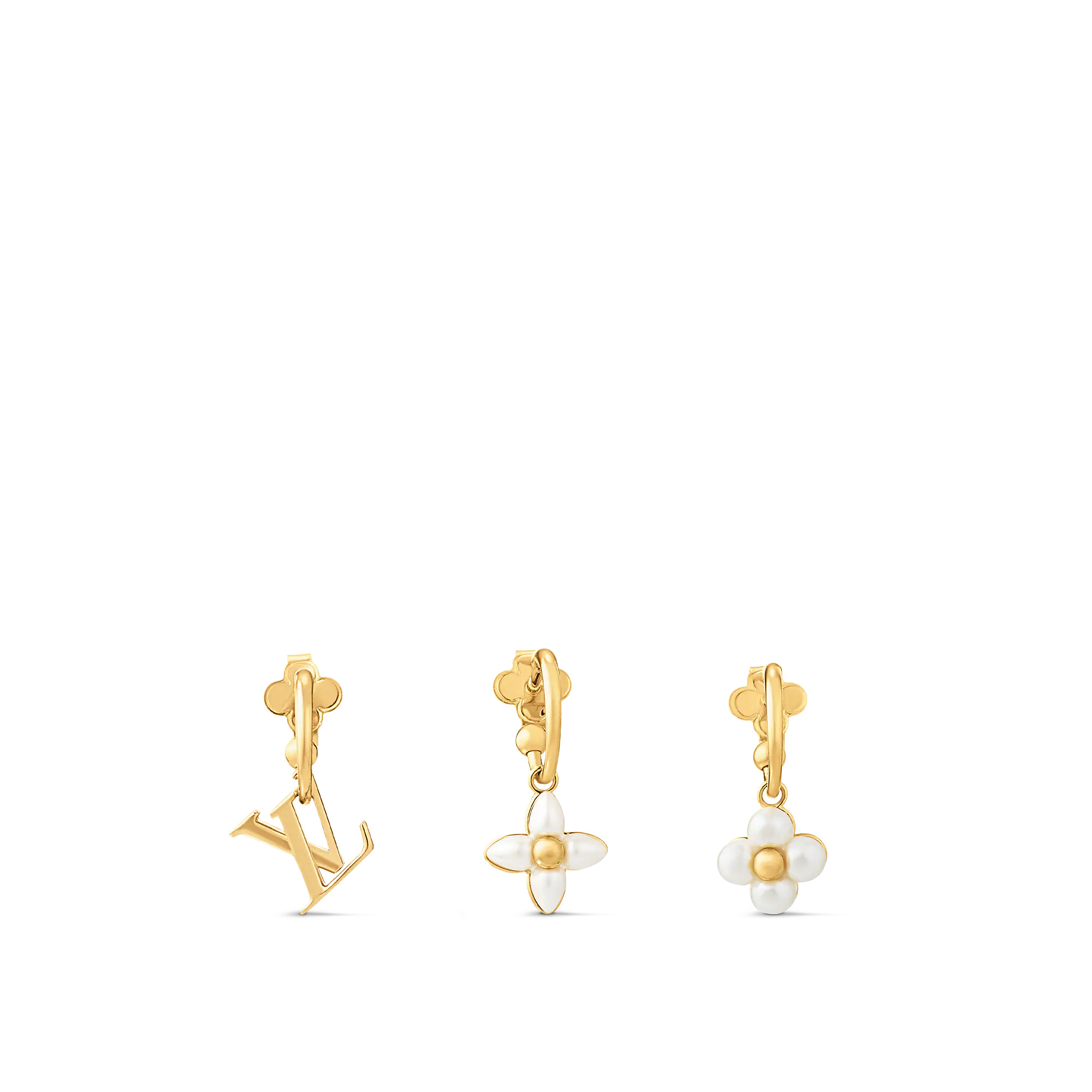 Each piece in this set of LV Floragram earrings highlights a different Louis Vuitton symbol. The coordinating designs individually showcase a pointed Monogram Flower, a rounded Monogram Flower, and the LV initials. A shared celebration of iconic motifs unites this trio of mismatched earrings for a youthful take on House signatures. - Length: ~0.4 in/cm - Weight: ~0.06 oz/1.7 g, ~0.06 oz/1.8 g, ~0.04 oz/1.3 g - Metal with gold-color finish - LV Initials - Monogram Flowers - Three-earring set