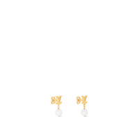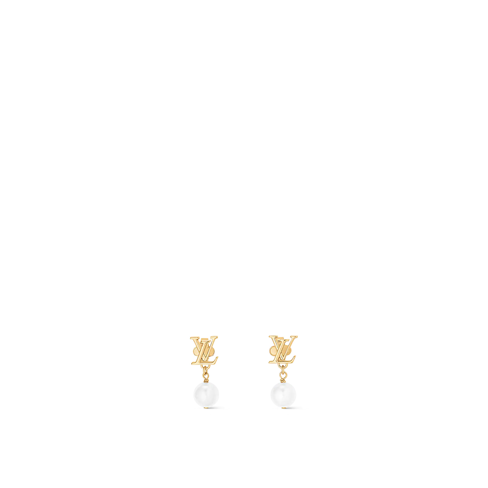 The LV Iconic Louisa earrings combine a classic Louis Vuitton emblem with the lustrous beauty of the pearl, a precious symbol of love and purity. Their delicate design features gleaming white resin pearls suspended from gold-finish studs spelling out the House initials. Light and easy to wear, they radiate glamour and sophistication. - Metal with gold-color finish - White resin pearls - LV Iconic signature