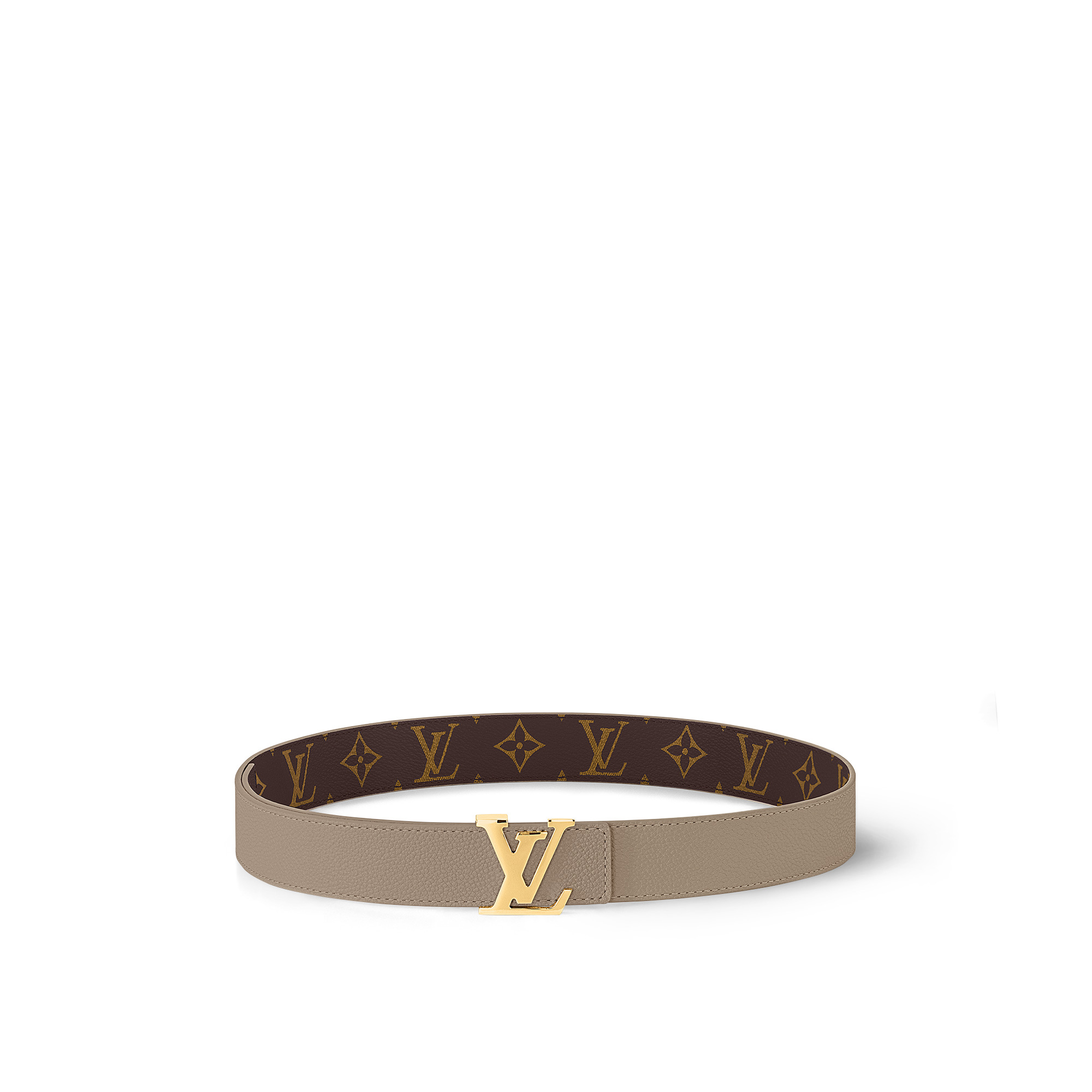 The stylish LV Initiales belt now comes in sophisticated shade of beige calfskin. Reversible, with Monogram canvas on the other side for a classic signature look, it pairs well with everyday outfits, worn over trousers or a skirt. A nice addition to the rainbow of colors in the LV Initiales series. Detailed Features - Width: 1.1 inches/3 cm - Buckle height: 1.4 inches/3.5 cm - Buckle width: 1.4 inches/3.5 cm - Monogram canvas recto side - Tourterelle Beige calf leather verso side - Gold-color hardware - LV Initiales buckle Length: 31.5 inches Width: 11.8 inches