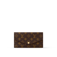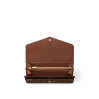 One of Louis Vuitton's classic models, the Sarah wallet combines Monogram canvas with a grained-leather lining. Its elegant envelope-style design conceals a spacious interior with two large compartments, a central zipped coin pocket and multiple card slots. The perfect choice to keep all essentials in one safe place. Detailed Features - Brown - Monogram coated canvas - Grained cowhide-leather lining - Gold-color hardware - Press-stud closure - 2 large gusseted compartments - Zipped coin pocket - Inside flat pocket - Outside flat pocket - 16 card slots - The reference is either made in France, Spain, Italy or in the US. Length: 7.5 inches Height: 3.9 inches