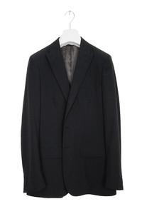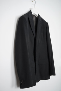 HELMUT LANG 2000 A/W PEAK LAPEL JACKET IN COATED WOOL Dark charcoal grey blazer in 2-button peak lapel design. Part of the runaway show look as well as worn by Helmut Lang himself. Crafted from unique wool/polyester coated fabric. Brand new condition! Made in Italy, size 46. arm pit to arm pit: 50.5cm, shoulder to shoulder: 42cm, sleeves: 67cm, back length: 77cm