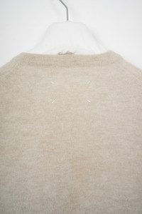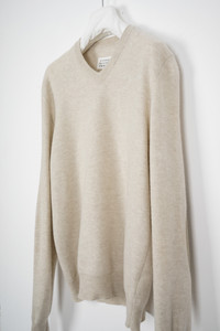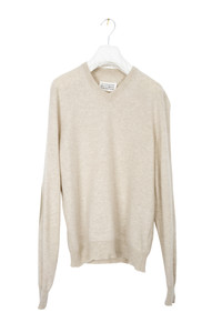 MAISON MARTIN MARGIELA classic 14-line v-neck sweater in a beige/oatmeal tone with lamb leather elbow patches. Very high quality wool. Size S (based on measurements). Good, condition with one minor repair, see last pics.