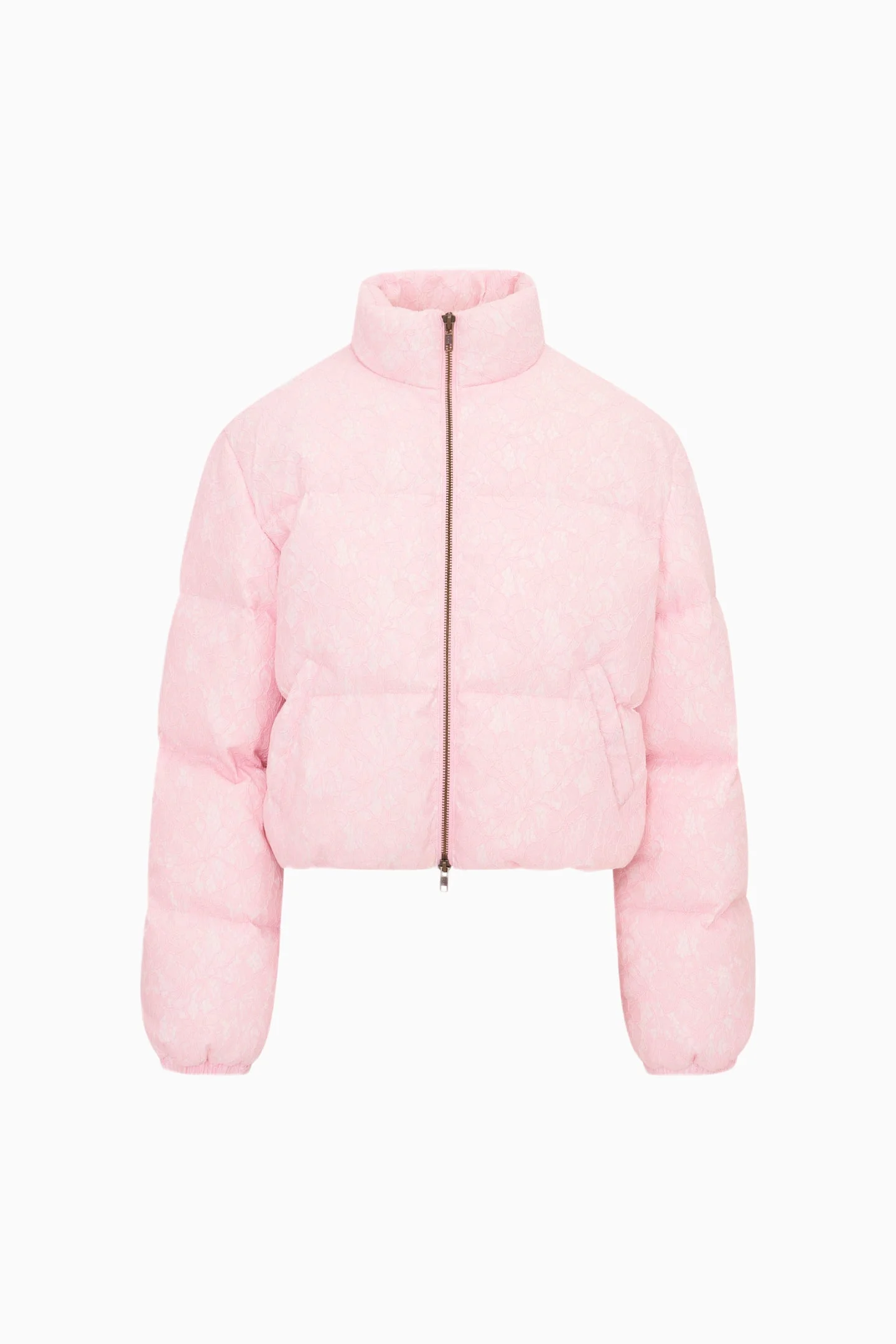 The Celesta Jacket reimagines outerwear with a feminine touch. Designed from quartered lace bonded to lightweight nylon, this cropped puffer blends warmth with delicate detail. Filled with down insulation, it offers cozy protection while maintaining a romantic silhouette. Full sleeves with elastic cuffs, a high collar, and slash pockets at the waist balance function and style, and a front zipper closure makes it effortless to wear. Quilted and cropped, the Celesta is the must-have piece for cold weather layering. - 100% Nylon exterior - Down-filled - Cropped puffer silhouette - High collar and elastic sleeve cuffs - Slash pockets at waist - Front zipper closure DETAILS - Self: 100% Nylon - Combo: 51% Rayon - 27% Cotton - 22% Nylon - Lining: 55% Polyester - 45% Viscose - Filling: 100% Duck Down - Dry Clean Or Machine Wash In Cold Water - Tumble Dry Low - Cool Iron SIZE & FIT Measurements based on Size S: - Bust: 47 3/4" - Sweep: 48" - Length: 21 3/8" - Sleeve Length: 32 3/4"