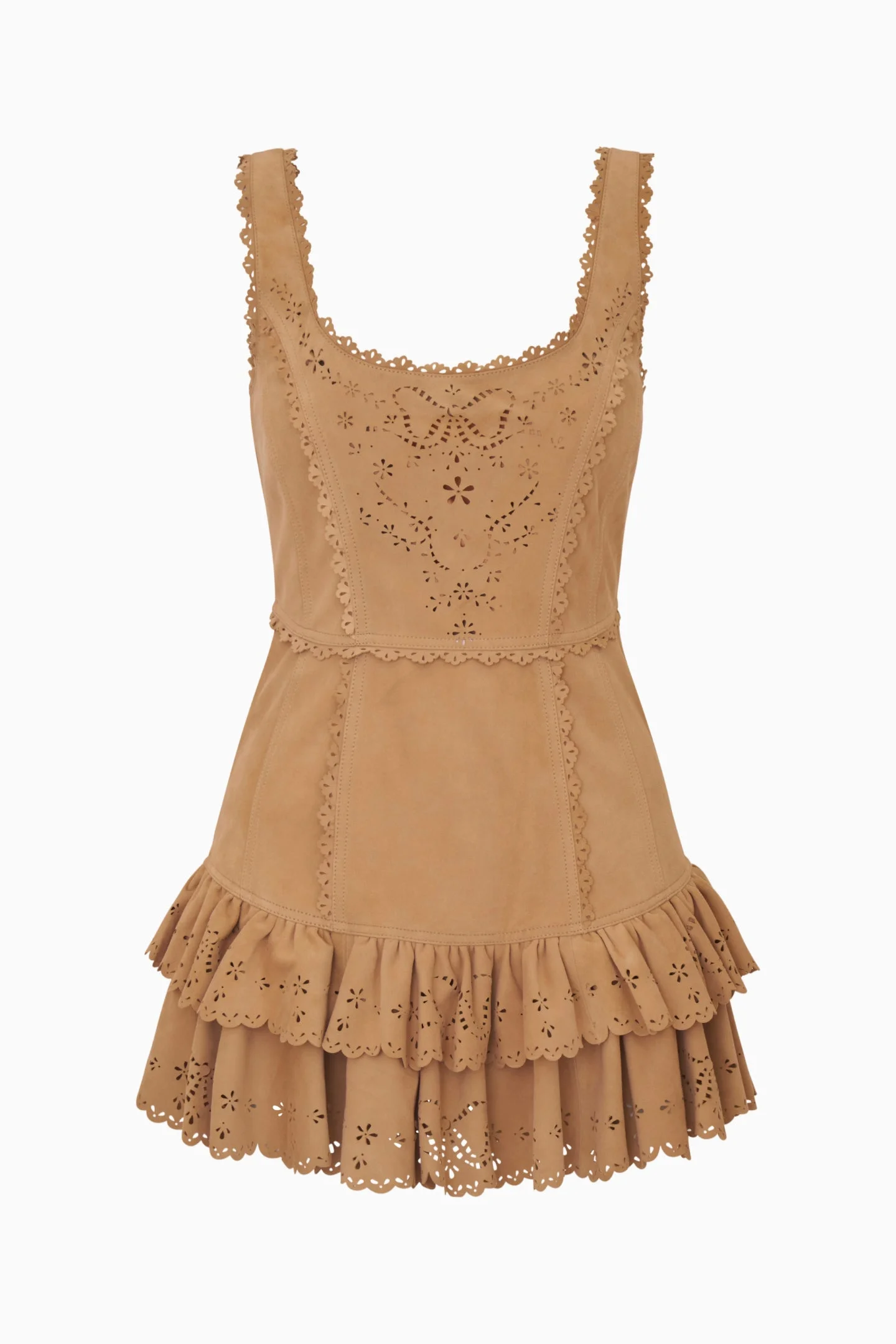 This dreamy A-line mini crafted from soft, premium suede features a flattering fitted waist and a flirty two-tiered flared skirt finished with romantic ruffles. Signature scallop floral laser eyelets create a beautiful all-over pattern, while the scoop neckline and bow eyelet add effortlessly chic appeal. Details: - Mini length - A-line silhouette with fitted waist - Two-tiered ruffled skirt - All-over floral eyelet cutwork - Scoop neckline - Invisible zipper at back DETAILS 100% Lamb Leather SIZE & FIT Measurements based on Size 4: - Model Height: 5' 9 1/2" - Length: 31 1/2" - Bust: 33" - Waist: 28" - High Hip: 34" - Low Hip :38" - Sweep: 116 1/2" - Lining: 28 1/2" -